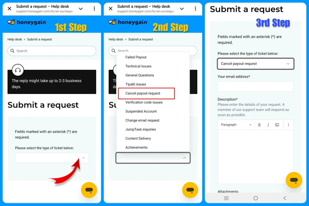- Discription में लिखना है कि /Honeygain Payment Reject हो गया है Paypal Account Problem की वजह से इस लिए हमारा Honeygain Credit वापस कर दे फिर हम Jumptask से Payout Apply करेंगे।