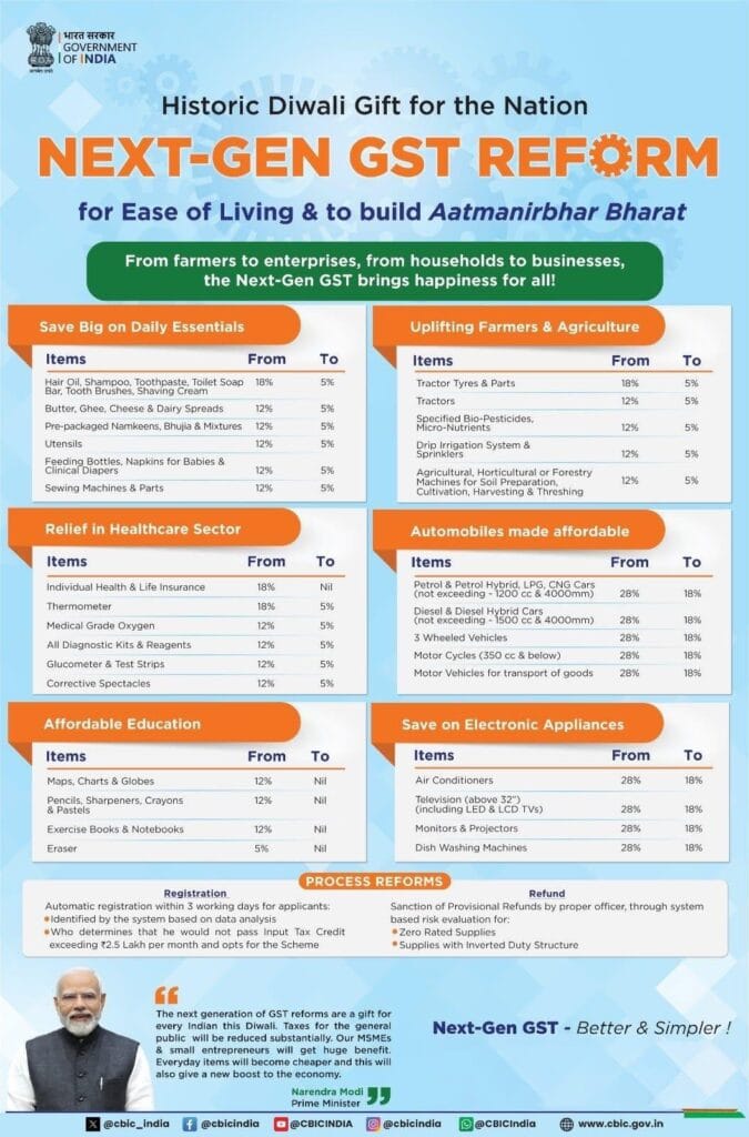 Next-Gen GST Reform: इस दिवाली देशवासियों के लिए तोहफा कुछ खास है। मोदी सरकार ने “नेक्स्ट-जेन जीएसटी रिफॉर्म” का ऐलान किया है। इसका सीधा असर आम लोगों की जेब पर पड़ेगा। रोजमर्रा की आवश्यक वस्तुओं से लेकर कृषि इनपुट, शिक्षा, स्वास्थ्य और इलेक्ट्रॉनिक उपकरणों तक – कई उत्पादों पर जीएसटी कम कर दिया गया है।